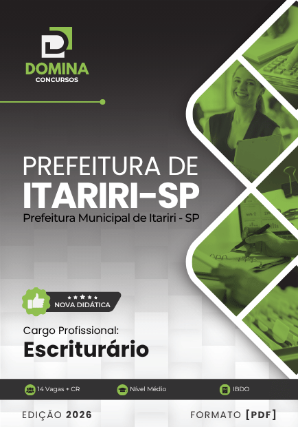 Prepare-se com o material mais completo para o Concurso Prefeitura de Itariri - SP 2026! Nossa apostila, atualizada e alinhada ao edital, está disponível para download imediato em formato PDF.